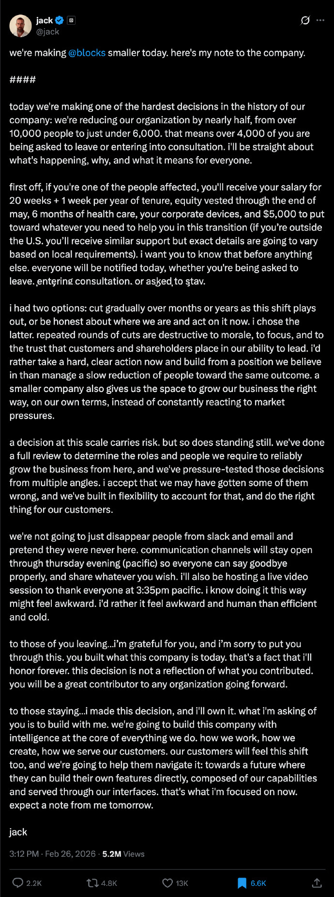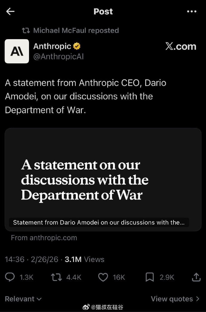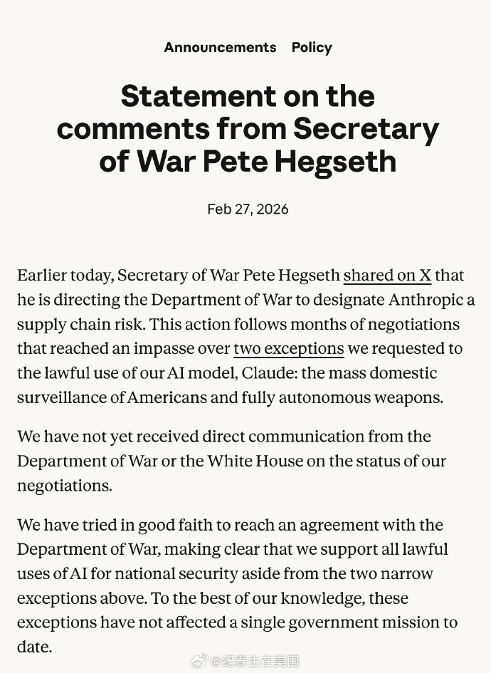 “今天早些时候,战争部长Pete Hegseth在 X 上发文称,他正指示战争部将 Anthropic 指定为“供应链风险”。这一行动是在与战争部进行了数月谈判之后采取的;谈判因我们就 Claude(我们的 AI 模型)的合法使用提出的两项例外请求而陷入僵局:对美国人进行大规模国内监控,以及完全自主武器。