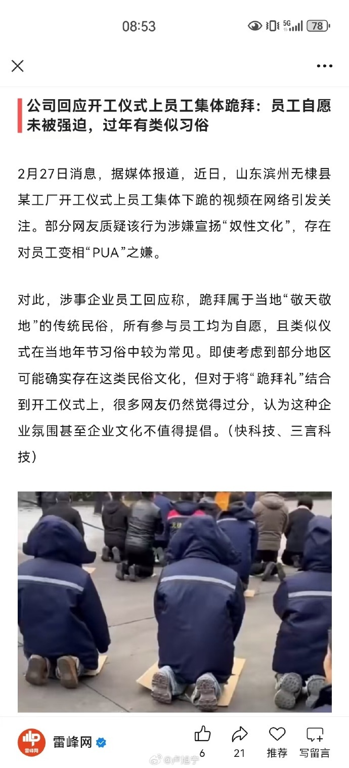 【7】公司回应开工仪式上员工集体跪拜:员工自愿未被强迫,过年有类似习俗