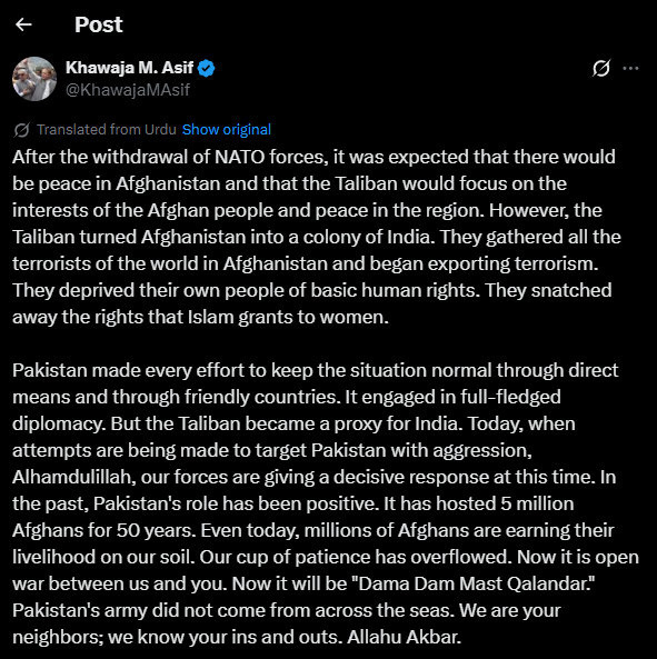【9】外媒:巴基斯坦防长称“耐心已经耗尽”,巴方对阿富汗政府“公开宣战”
