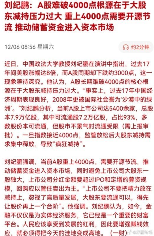 【4】刘纪鹏:A股长期难破4000点的核心根源在于大股东减持压力过大。