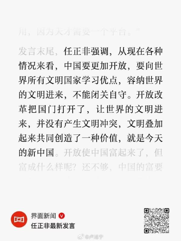 【19】任正非强调,从现在各种情况来看,中国要更加开放,要向世界所有文明国家学习优点,容纳世界的文明进来,不能闭关自守。开放改革把国门打开了,让世界的文明进来,并没有产生文明冲突,文明叠加起来共同创造了一种价值,就是今天的新中国