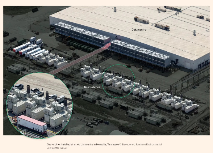 【15】根据金融时报,画面中是田纳西州孟菲斯的 xAI 机房,旁边排成一整列,是白色的天然气涡轮发电机,目的只有一个,自己发电、自己烧气,直接绕过早已满载的公共电网来撑算力。