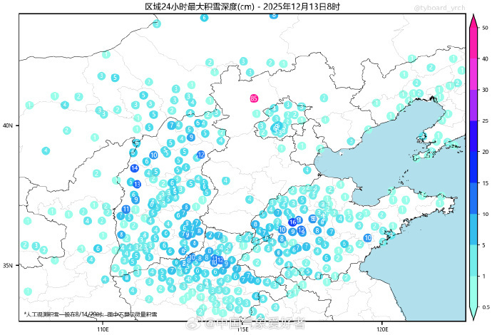 本轮降雪区内山东长清积雪16厘米、山西兴县14厘米、河南延津12厘米、北京海淀和门头沟6厘米、陕西黄龙6厘米、安徽亳州和砀山4厘米、江苏丰县3厘米为各省最大积雪深度;主要城市中济南积雪11厘米、太原6厘米、郑州5厘米、石家庄4厘米、北京3厘米,天津、兰州也观测到降雪但没有形成积雪。济南本次积雪深度为近40年来12月最厚,长清更是打破了12月最大积雪深度记录!