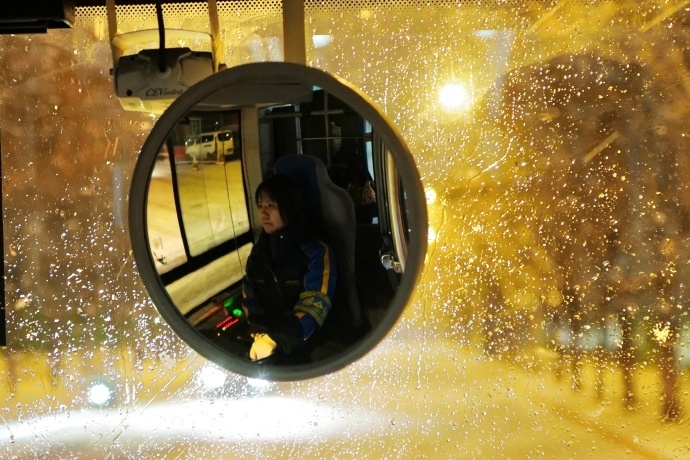 大雪夜,一位公交女司机凝重而稳重的目视前方,车轮在碎冰上吱吱作响,你相信她一定能抵达。