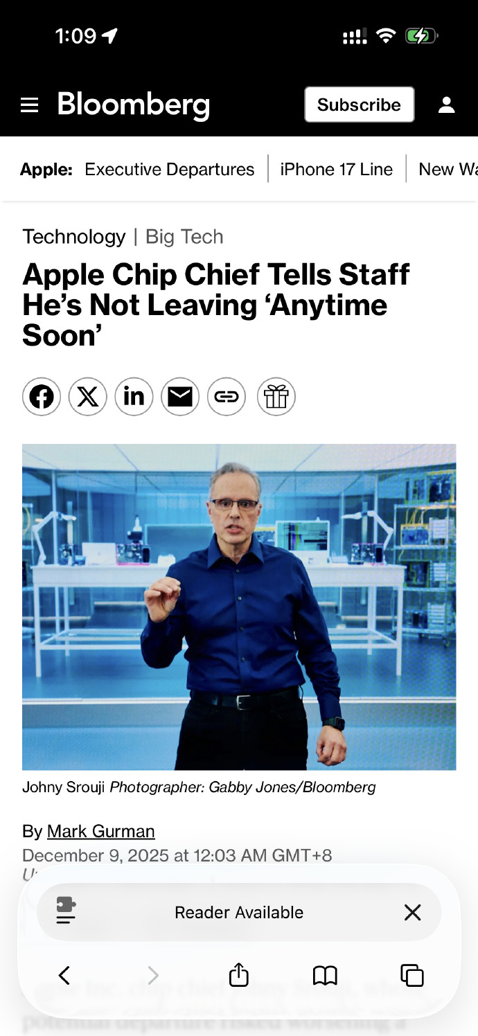 【14】彭博社来去之间:苹果公司硬件副总裁 Johny Srouji 短期之内不会离职