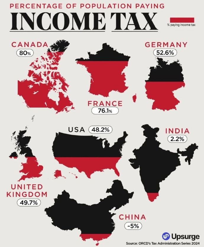 【19】不同国家缴纳所得税的人口占比的信息图,核心呈现各国需缴纳个税的人群在总人口中的比例