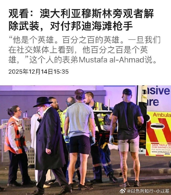 一对父子在澳大利亚海滩的光明节庆祝活动上发动恐袭,造成包括以色列人在内的数十人死伤。一名参加活动的穆斯林制服了一个枪手,他自己也受伤。这是绝对的英雄行为。