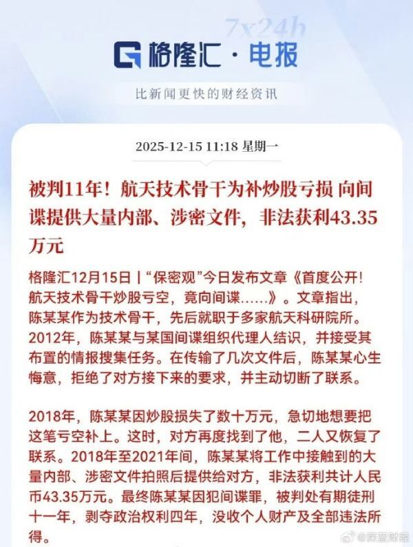 【5】航天技术骨干为补炒股亏损,向间谍提供大量内部、涉密文件,非法获利43.35万元