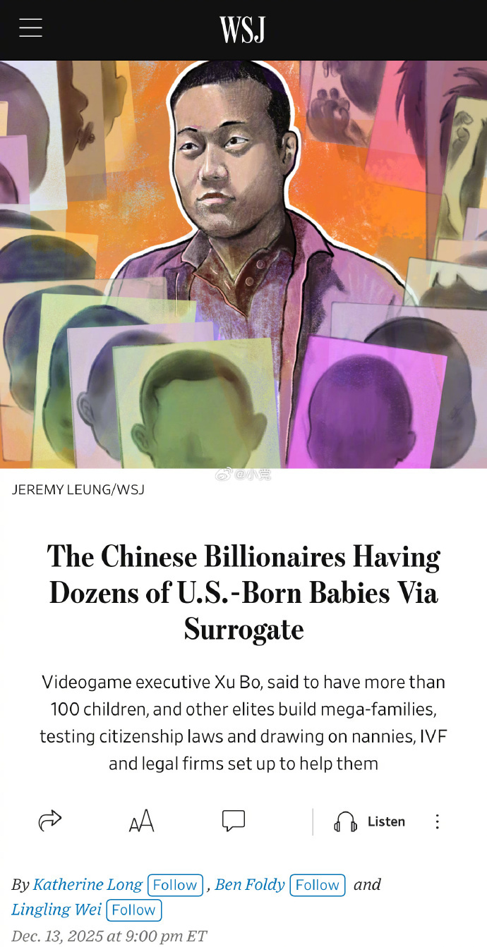 一位中国富豪,像汪辉武一样从事教育生意,曾想一次性使用代孕生下超过200个孩子,设想家族企业,张说。“我直接问他,‘你计划如何抚养所有这些孩子?’他哑口无言,”张说,他拒绝了这位客户。#美媒揭露中国亿万富翁赴美代孕生子#
