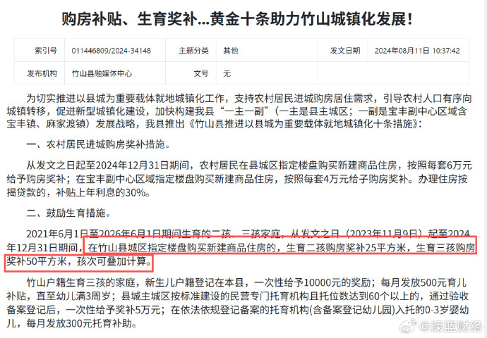 【5】湖北省竹山县推了一个育儿新政,生孩子,送房子,二胎补贴25平,三胎补贴50平,二者可以叠加。也就是说,生完三胎,政府直接奖励75平米的房子。