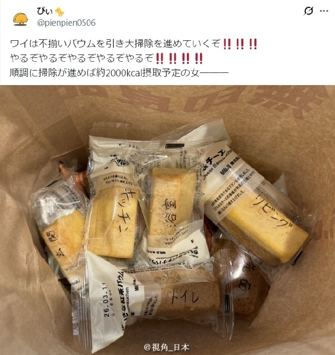 【19】趣闻:年末大扫除,日本妹子用这种方法激励自己。在每一包零食上写上地点,比如厨房、浴室、客厅、厕所。抽到哪里就打扫哪里,然后吃掉。如果一切顺利的话大扫除结束时她将吃下2000kcal。