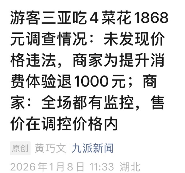 【6】游客三亚吃4菜花1868元调查情况:未发现价格违法,商家为提升消费体验退1000元;商家:全场都有监控,售价在调控价格内