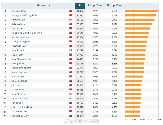 在根据一项以学术出版量为指标的全球排名:荷兰莱顿大学科学与技术研究中心的莱顿世界高校排名中,浙江大学位列第一,上海交通大学排名第二,哈佛大学第三,四川大学第四,中南大学排第五。七所中国高校也进入了前十,清华第九,北大13。