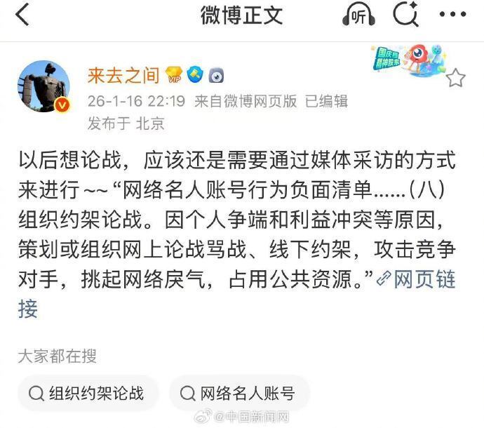 西贝贾国龙与罗永浩线上之争持续受到关注。1月16日晚间,新浪微博CEO王高飞通过个人微博@来去之间 发布最新消息:以后想论战,应该还是需要通过媒体采访的方式来进行。