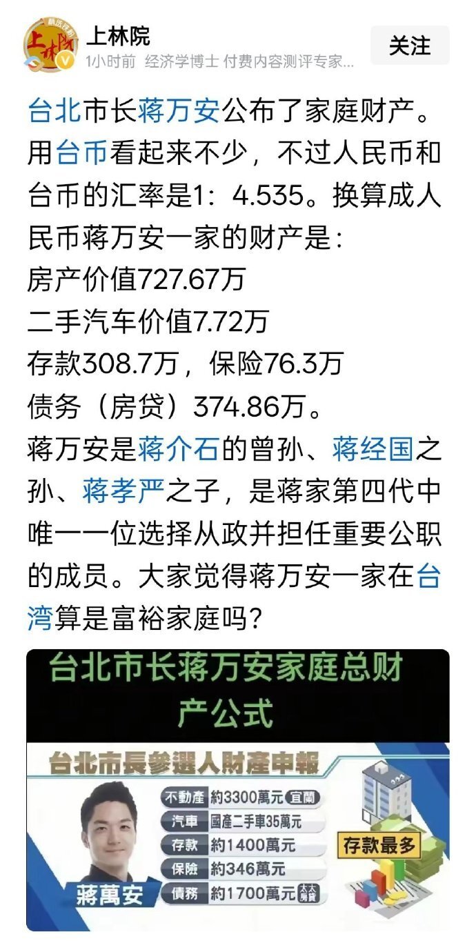 【25】蒋万安的家庭财产公开了,多少暂不评价,不知道台湾民主对公布的官员财产是否相信?