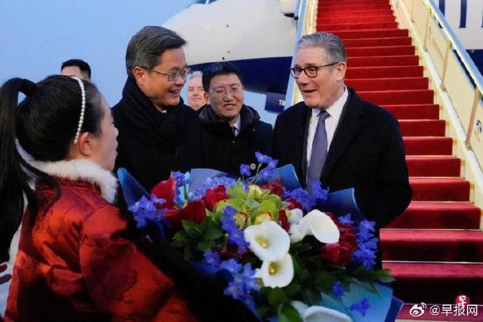 斯塔默星期三下午乘机抵达北京首都国际机场,开启为期四天的访华行程。中国财政部长蓝佛安到机场迎接。