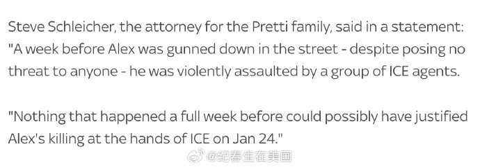 “在Alex在街头遭枪杀的一周前,他在并未对任何人构成威胁的情况下,被一群ICE特工暴力袭击。无论发生在整整一周前的任何事情,都不可能成为ICE在1月24日夺走Alex生命的正当理由。”