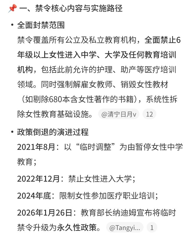 时间线:2021年禁止女性接受中学教育;2022年禁止女性接受大学教育;2026年永久禁止女性接受教育。