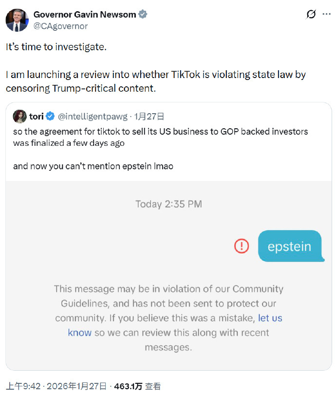 【24】TikTok 私信不能发“Epstein”关键词的问题(微博正文)应该是存在的,至少在部分用户中存在。加州州长纽森已经宣布要调查这事儿了。而 TikTok 在美国的发言人说不是他们禁的,他们也不知道怎么回事。