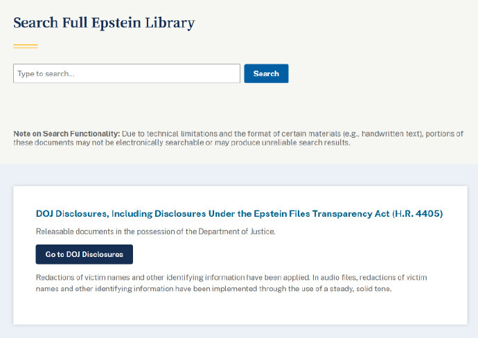【16】截至目前公开、可下载并能在法庭或执法语境里被核验的“爱泼斯坦披露文件”里,并不存在“吃人/食人”的确凿证据(也没有与“食人”相关的正式指控、起诉书要件或法医证据链)。大家如果可以上网,可以到美国司法部DOJ发布材料的官网进行关键字搜索。截图是司法部爱泼斯坦文件入口官网。这是最直接的原始和一手材料。