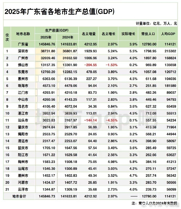 1. 2025年全国实际增速是5%,名义增速4%。广东省超过全国线的只有深圳和梅州。梅州增速最快,达到5.8%。