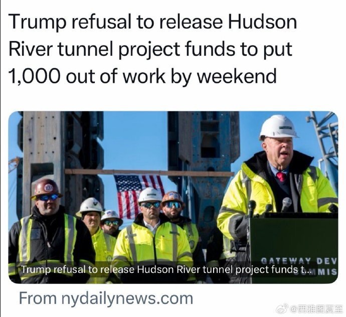 哈德逊河隧道工程,如果明天拿不到资金,本周末上千工人会暂时失业