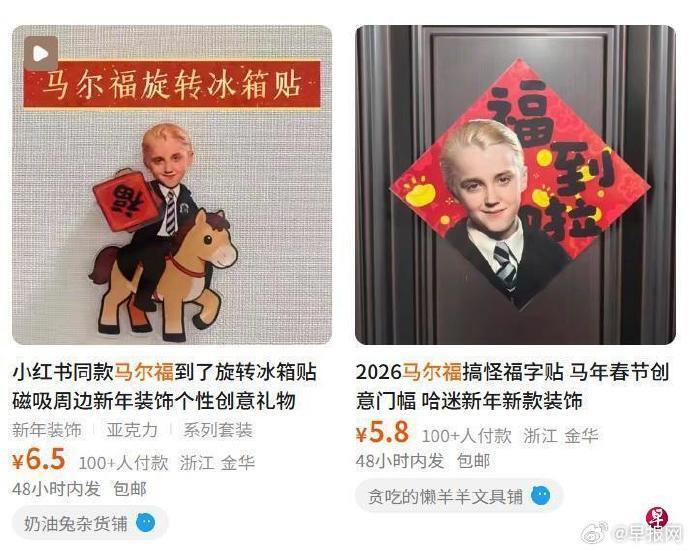 “马尔福”被解读为“马年尔等有福了”,网友将马尔福的头像与传统的福字斗方进行结合,变成了新潮款式的福字,还有网友自制了马尔福冰箱贴,Q版马尔福坐在卡通马上,寓意“马上有福”。此外,还衍生出了更多马尔福新春装饰品,比如对联“马尔有福送祥瑞,斯莱特林保平安”,横批“拽哥高贵”。