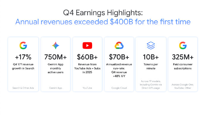 Q4各业务线表现强劲:搜索加速增长17%,YouTube突破600亿。Google Cloud收入增长48%,年化运营收入超700亿美元,Cloud积压订单环比增长55%达到2400亿美元。