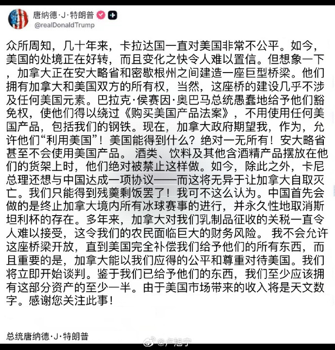 在贴文中,他还大骂卡尼达成的加中贸易协议会让中国控制加拿大,取消冰球运动,而美国只能“捡点剩菜剩饭”。