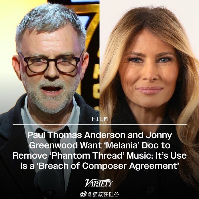 【15】奥斯卡提名导演保罗·托马斯·安德森(Paul Thomas Anderson)与Radiohead吉他手、作曲家强尼·格林伍德(Jonny Greenwood)周一发表联合声明,要求亚马逊MGM工作室制作的纪录片《梅拉尼娅》(Melania)移除其中使用的《魅影缝匠》(Phantom Thread)配乐片段。