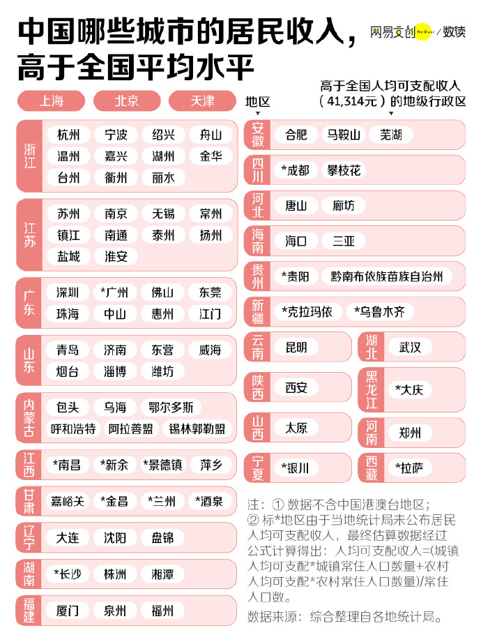 【4】浙江均衡发展和民富的优等生,数据显示,浙江省是全国唯一一个所有地级市人均可支配收入均跨越全国平均线的省份。网易新闻制图。