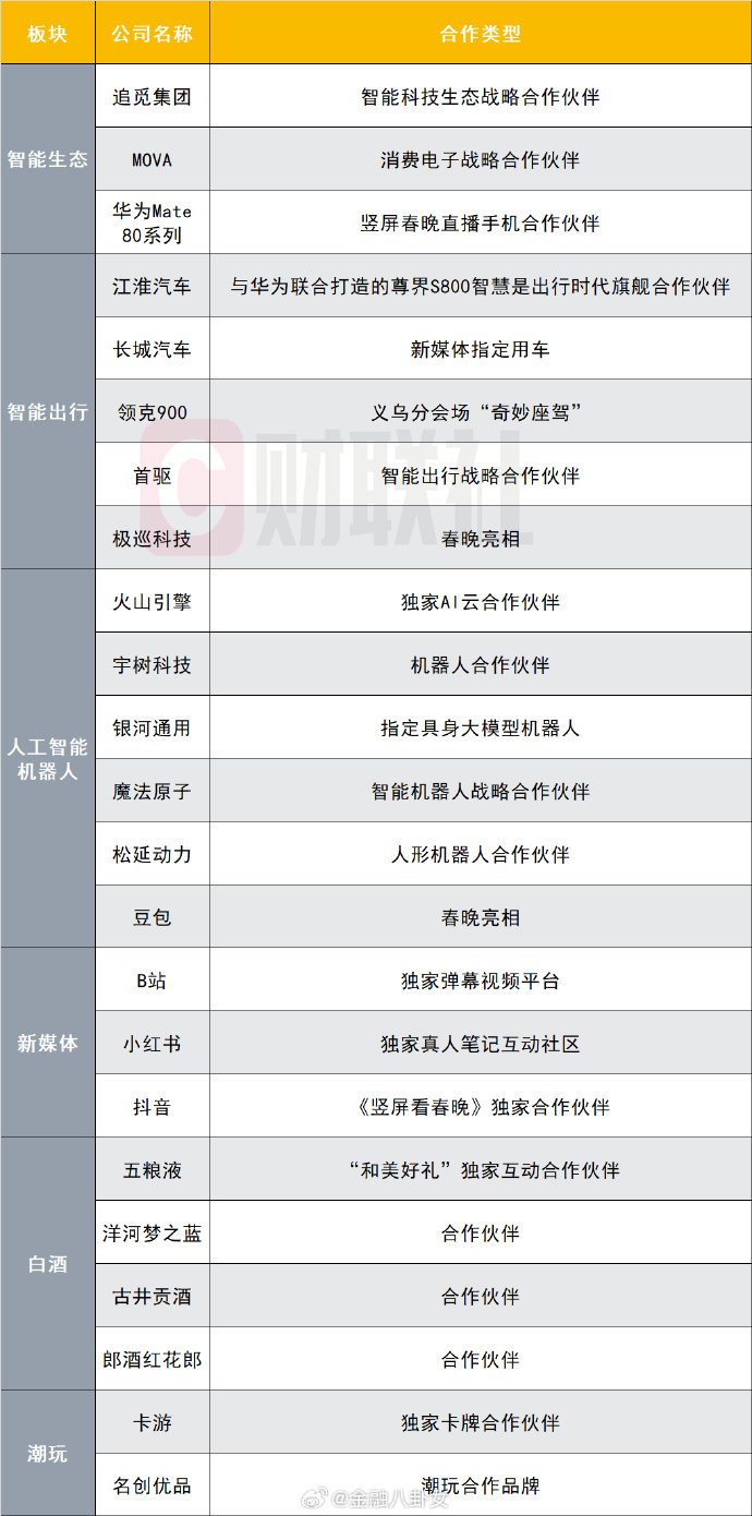 【2】春晚合作公司名单来了。据不完全统计,截至目前,总台春晚已官宣的合作伙伴已超20家,覆盖智能出行、人工智能机器人、白酒等多个领域