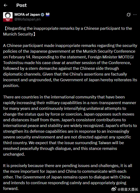 2月14日,在慕尼黑安全会议上,一名中国与会者就日本政府的安全政策发表了不当言论。