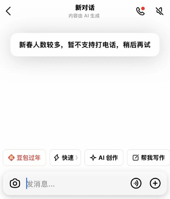 豆包APP目前暂停了视频通话功能,页面显示“新春人数较多,暂不支持此功能”,或因算力压力所致。据悉,今日除夕,豆包将通过总台春晚进行红包互动。