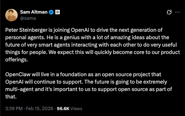 根据 Altman 的声明,OpenClaw 将作为开源项目继续存在于一个基金会中,OpenAI 会持续支持。Altman 强调,未来将是"极度多智能体"的时代,而支持开源是这一愿景的重要组成部分。