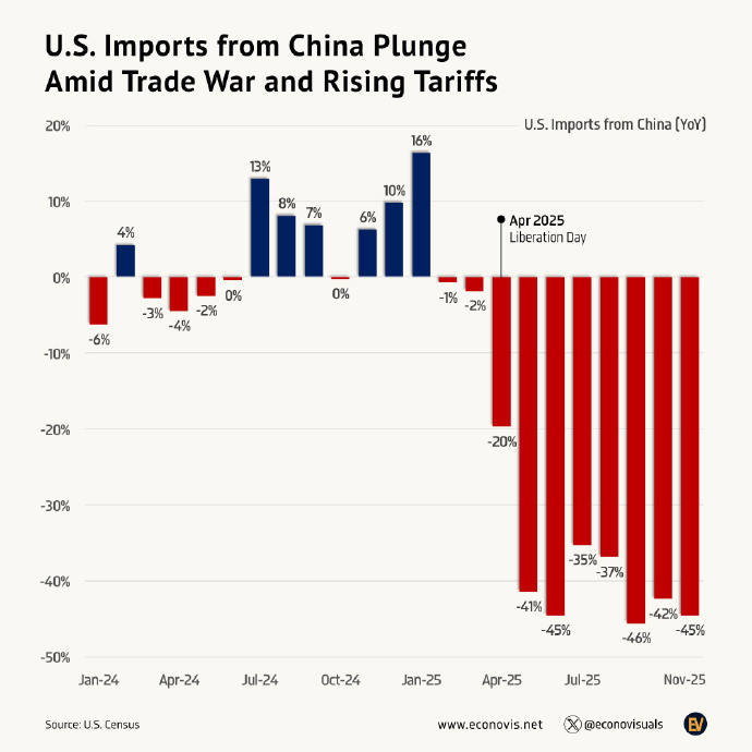【15】受贸易战和关税上涨影响,美国从中国的进口大幅下降。2025年5月至11月期间,美国从中国的进口额大幅下降,反映出关税升级和贸易紧张局势的影响。在此期间,进口额比2024年同期下降了41%。