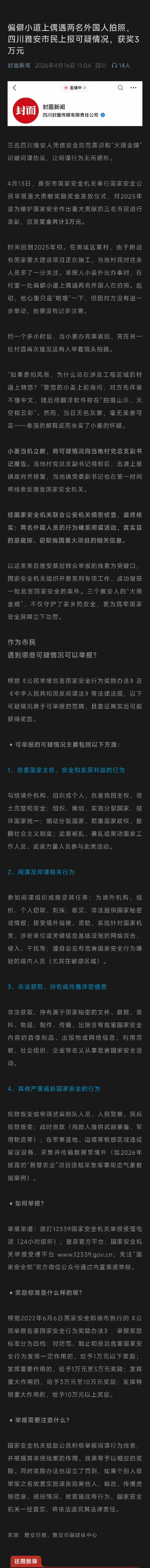 【6】偏僻小道上偶遇两名外国人拍照,四川雅安市民上报可疑情况,获奖3万元