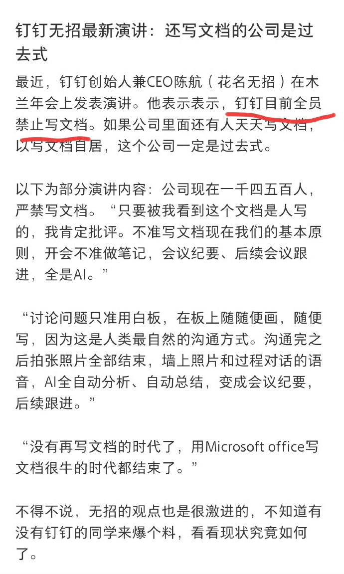 【9】钉钉目前全员禁止写文档? 钉钉CEO:被我发现肯定批评,都由AI来写