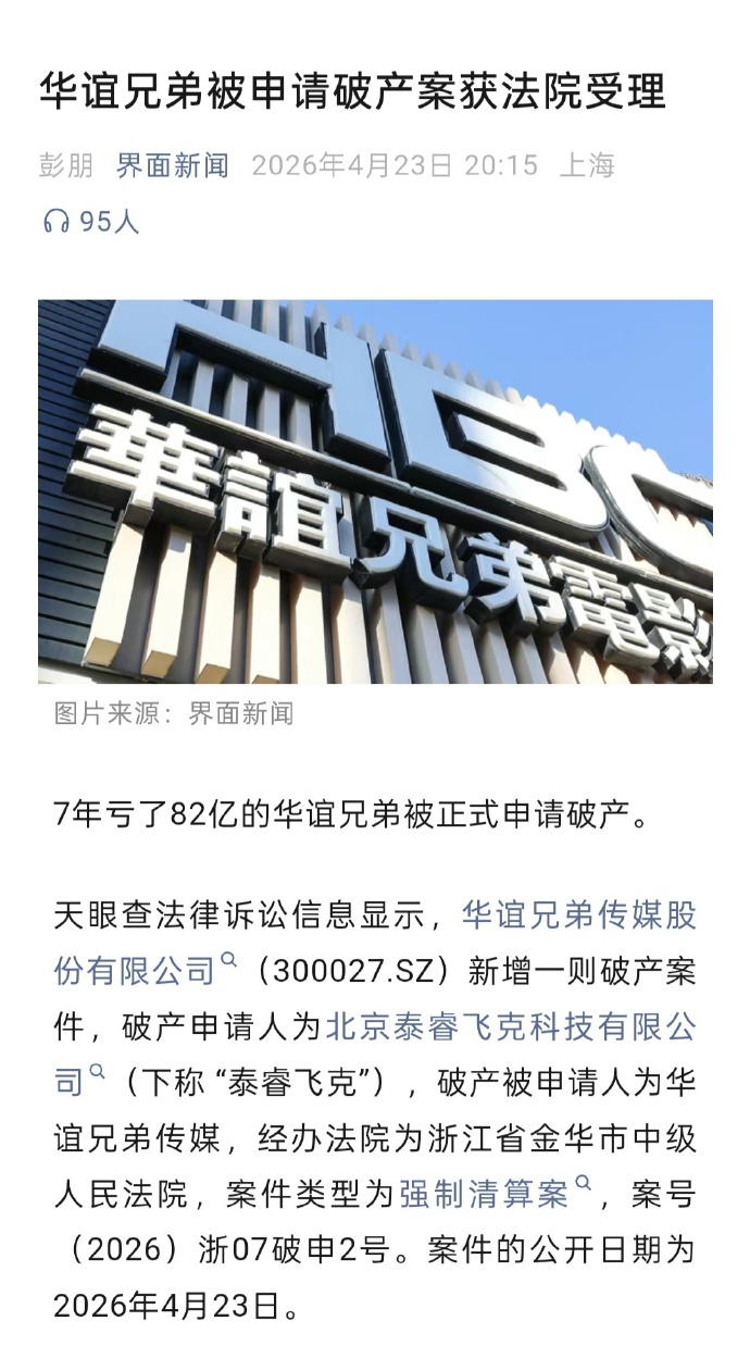 【6】华谊兄弟被申请破产。巅峰期市值900亿,目前市值只剩54亿。