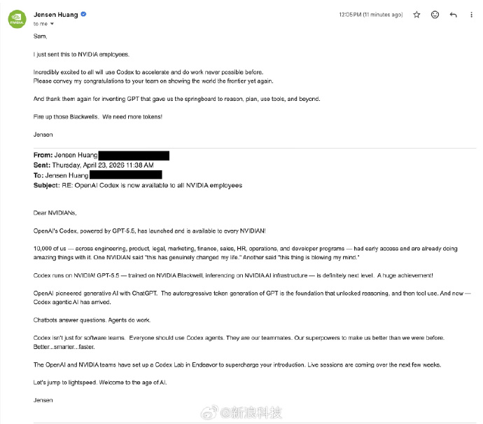 #GPT5.5表现如何##OpenAI和英伟达高度合作#OpenAI首席执行官萨姆·奥特曼在社交平台上分享了英伟达CEO黄仁勋发给他的一封电邮,后者附上了他给英伟达全体员工的一封电邮,要求他们使用OpenAI的Codex编程工具。黄仁勋在邮件中写道:“亲爱的英伟达员工们,基于GPT-5.5的OpenAI Codex现已正式发布,面向所有英伟达员工开放!我们10000名员工——涵盖工程、产品、法务、市场营销、财务、销售、人力资源、运营和开发者项目等各个部门——都已提前体验,并已用它创造了许多令人惊叹的成果……Codex不仅适用于软件团队,每个人都应该使用Codex智能体。它们是我们的队友,是让我们超越以往的超能力。更好、更智能、更快。OpenAl 和英伟达团队在Endeavor中搭建了一个 Codex 实验室,旨在极大地促进你们的入门学习。未来几周将举办一系列线上研讨会。让我们一起迈向光速时代。欢迎来到人工智能时代。”