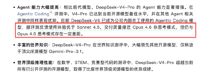 比较有意思的是 DeepSeek 主动拿自家模型去对标 Anthropic:内部员工实际使用 V4-Pro 做 Agentic Coding(让 AI 自主完成编程任务),反馈体验优于 Claude Sonnet 4.5,交付质量接近 Opus 4.6 的非思考模式,但跟 Opus 4.6 开启深度思考后还有差距。这种"主动承认差距"的表述在国内厂商的发布公告里不太常见,某种程度上也说明 Opus 4.6 思考模式已经成了行业的隐性天花板。