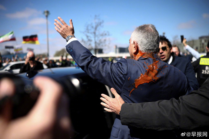 社交媒体上的视频显示,这位#伊朗#末代国王之子在离开一场新闻吹风会时,一名身份不明的男子从他背后靠近,向他泼洒看似番茄酱的液体,溅到他的外套和颈部。