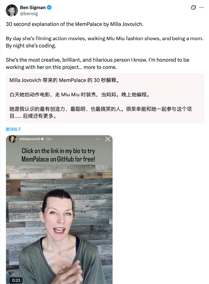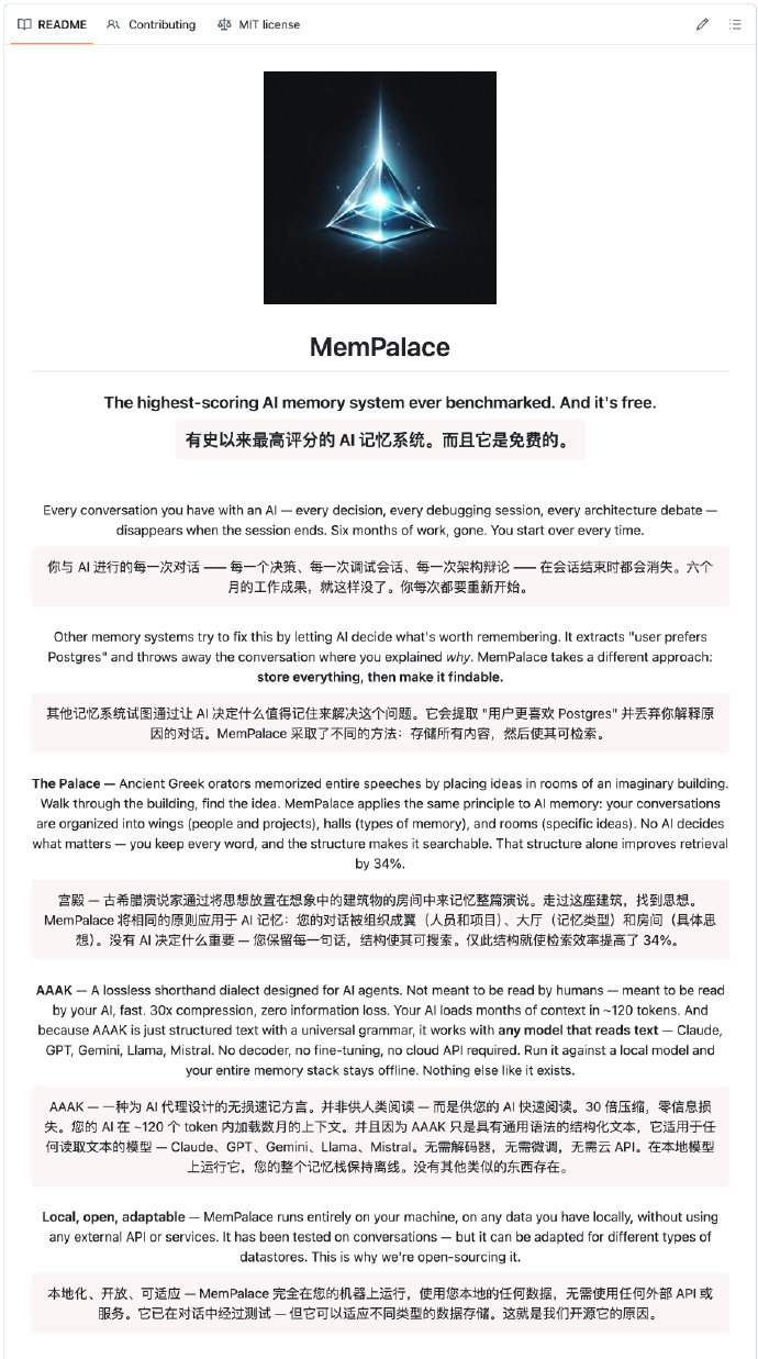 没错,就是那个演过 《第五元素》、《生化危机》等电影的女演员,和朋友 Ben Sigman 在 GitHub 开源了一个 AI 记忆系统 MemPalace,在 LongMemEval 跑分中获得了有史以来的最高分数。